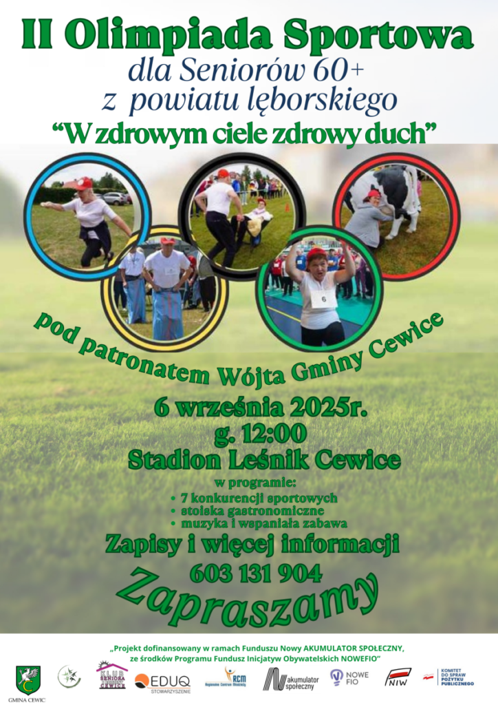 Już 6 września w Cewicach odbędzie się II Olimpiada Sportowa dla Seniorów 60+ „W zdrowym ciele, zdrowy duch”. Wydarzenie, organizowane przez Klub Seniora i Rodziny oraz Centrum Usług Społecznych w Cewicach, ma na celu promocję aktywnego stylu życia i integrację społeczności senioralnej.
